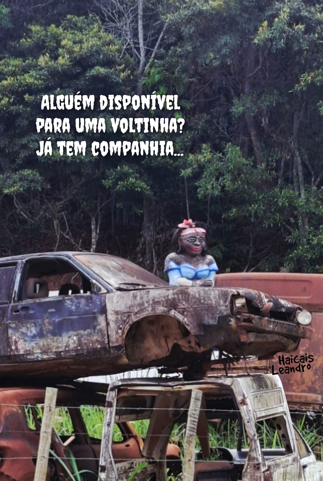 O outro acontecimento (a ida a Teófilo Otoni rendeu muitas histórias) surgiu no caminho, quase a chegar à cidade. Em um determinado ponto da estrada há um “cemitério de carros”, com uma infinidade deles, todos muito destruídos. Pois não é que alguém teve a brilhante ideia de espalhar bonecas namoradeiras por alguns deles? Aí não teve jeito…